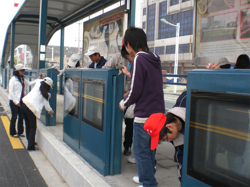 4月10日,让大学城的市民期盼以久的BRT即将开通了,在这BRT即将开通之际,电子系青年志愿者带着春天的气息来到了位于公司南门和西门前的BRT站台宣传交通文明安全,同时进行了站台清洁工作,保证候车者能在一个干净而整洁的场所等车。 下午13点,志愿者们带上抹布水桶去擦洗凳子和玻璃等。他们都干的津津有味,男生帮忙提水桶女生洗抹布擦站牌共同合作,不一会儿工夫就把公司附近的两个站台擦的干净明亮了。活动结束后所有参加这次活动的志愿者在站台前合影留念,作为一名青年志愿者,作为一名老员工,虽然我们能做的不多,但是只要我们做了就一定能得到社会的认同。
