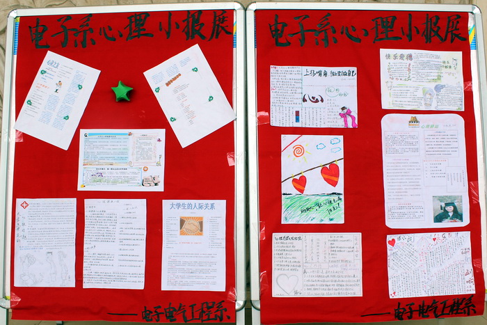 本次活动面向10级各班,共征集到17件作品。同学们以高昂的热情制作出了一幅幅精美的小报。这些作品紧紧围绕师生们关心的心理健康方面的热点问题,以及心理健康的常识、故事等。本次小报征集和展览活动,不仅使小报制作者学到了很多心理健康知识,也使驻足观看小报的其他同学加深了对心理健康的了解,对心理健康知识的普及和和谐校园的构建起到了一定的推动作用。