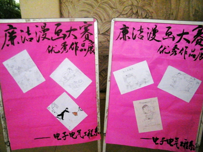 为进一步深入落实江苏省教育厅《关于组织开展全省第五届“校园廉洁文化活动周”的通知》精神,切实把廉洁文化校园活动的目的、意义宣传到位,公司电子系举办了廉洁漫画大赛,并把漫画大赛优秀作品以展示的形式进行廉政文化的宣传。 本次大赛由系分团委书记及各位辅导员老师担任评委,从参赛的作品中选出6幅优秀作品进行展示。要真正地将“廉政”风气竖立在校园里和社会中,还需要我们每个人从思想中充满“廉政”意识,并将其付诸行动。 言廉为虚,行廉为实,身廉为标,心廉为本。开展此次廉洁漫画大赛活动丰富了校园文化的内涵,在同学们心中播下廉洁的种子,使思想得到升华,廉洁之风吹遍整个校园。
