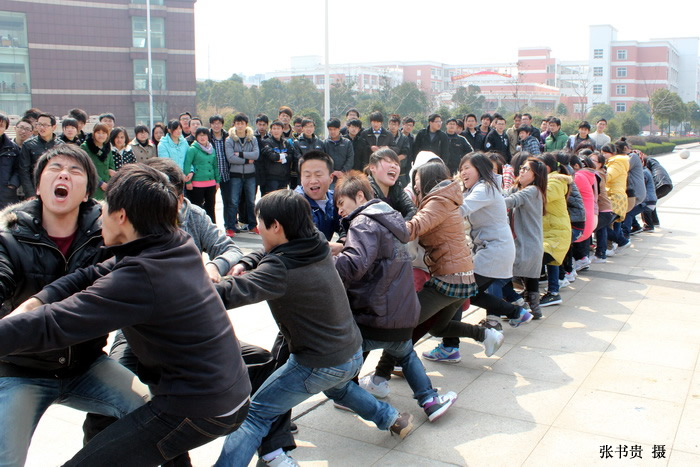 “一二,加油!”“一二,加油”随着有节奏的号子声,一根绳子在充满青春力量的手中绷得笔直。拨河比赛的现场呐喊声、助威声、欢笑声搅成一片,输赢已无关紧要,快乐才是绝对真正的主题。