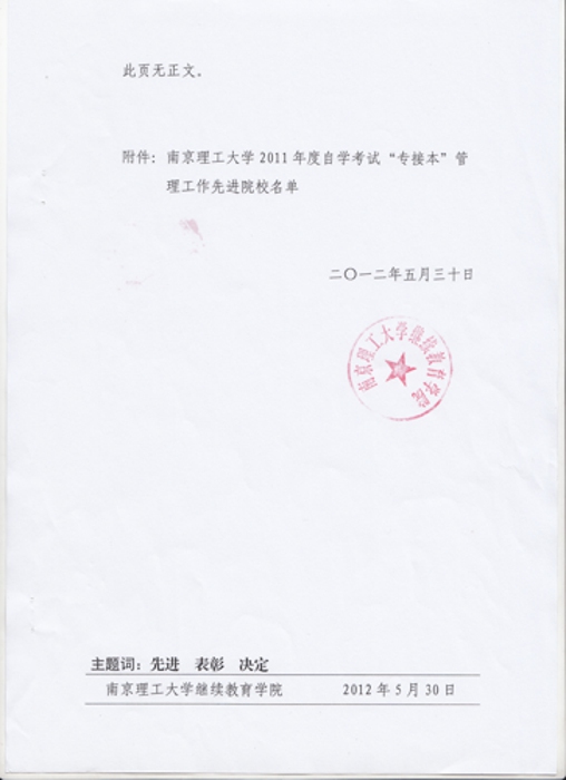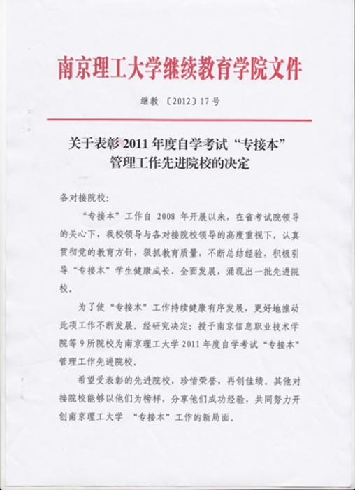 于表彰2012年度自学考试“专接本”管理工作先进院校的决定