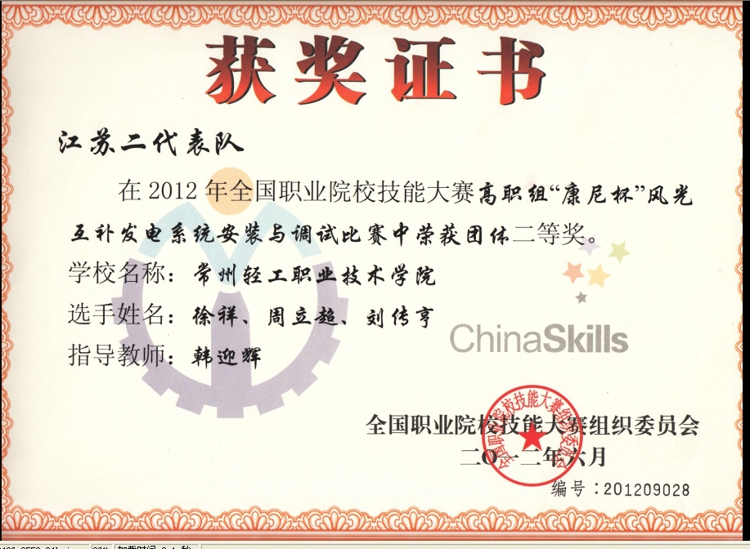 公司技能大赛代表队在领队杨劲松、指导教师韩迎辉的带领下,电子系员工徐祥、周立超、刘传亨在全国“风光互补发电系统安装与调试”项目中获得全国第五名,获二等奖。