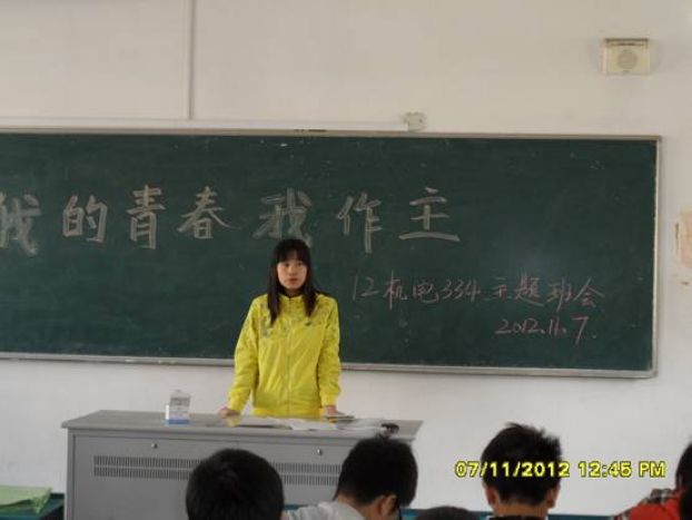 11月7日中午12:45在教学楼2406教室,12机电334班全体同学在班主任王石老师的组织下开展了以“我的青春我做主”为主题的班会,班会由副班主任孟雅琴主持。