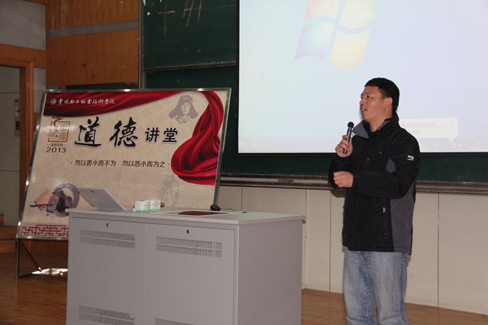 魏老师首先介绍了常州市“道德讲堂”活动起源,告诉同学们常州从“三次让国”的季子开始就是一个文明崇礼的城市。接着,魏老师通过文天祥与正气歌、宋代书法四大家中蔡京为什么会被蔡襄取代等几个历史故事告诉同学们中国从历史上就一直以人物的道德来衡量一个人的气节与成就。魏老师还从发生在电子系老师和员工身边的两件事,讲述了宋朝晖老师爱护员工和张欣欣拾金不昧的故事。最后,魏老师向同学们推荐了路遥的小说《平凡的世界》,希望同学们懂得生活对每个人都是公平的,只要努力就会有收获。