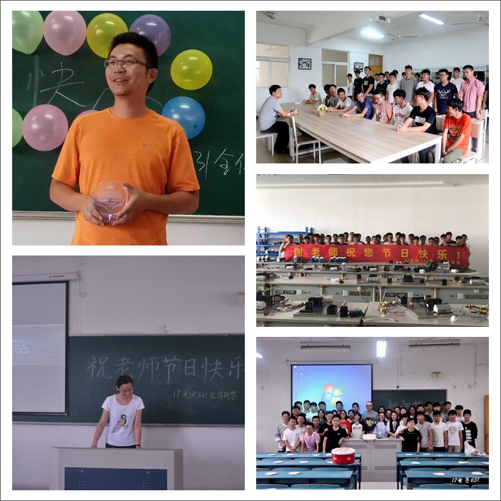 为了能够带给班主任一个惊喜,同学们早在暑假期间就开始头脑风暴策划活动,一开学立马进行排练和拍摄,祝福的话语汇聚在一个个视频中,只为了给辛苦工作一年的班主任们送上一份最真挚的心意。17自动33117自动33217自动631三个班拥有同一位班主任张书贵老师,他们邀请班主任来到教室与同学们一起观看祝福视频,随后现场同学们一同起立向班主任鞠躬致谢,感谢他一年的操劳与付出。17电子331的同学提前布置教室,将彩色的气球贴在黑板上,并向班主任丁华锋送上了特别定制的“中国好老师奖”……当班主任们看到同学们精心拍摄的祝福视频时,欣慰快乐的笑容漾上脸庞,这是对他们默默耕耘付出的最动人肯定。