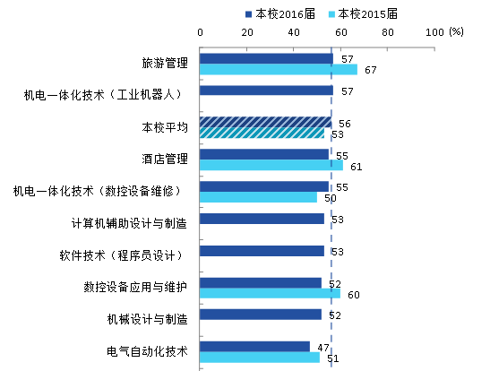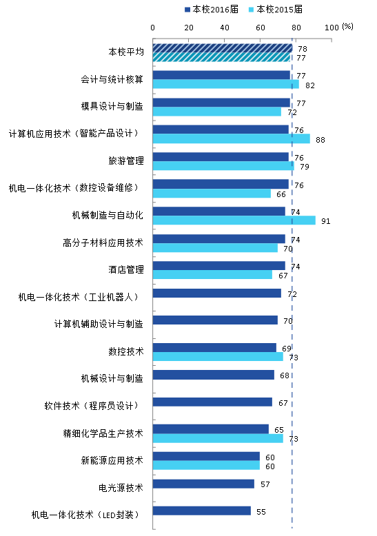根据毕业生就业调查,从2016年至2020年近5年来机电专业群毕业生对口就业率较高,分别为55.6%、60.5%、42.9%、43%、52.2%左右。员工就业满意度分别为73.4%、88.1%、83.6%、82.3%、78.5%左右,总体毕业生就业质量好,在平均水平线上。