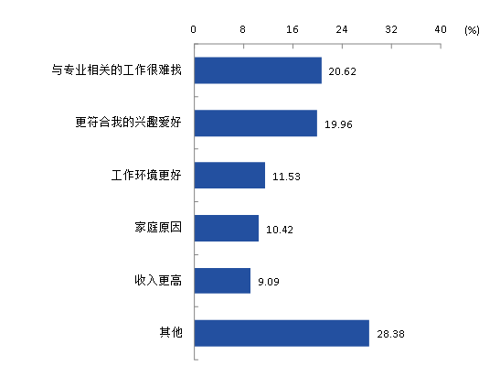本校2020届专科生选择专业无关工作的最主要原因是其他(28.38%),其次是与专业相关的工作很难找(20.62%)。