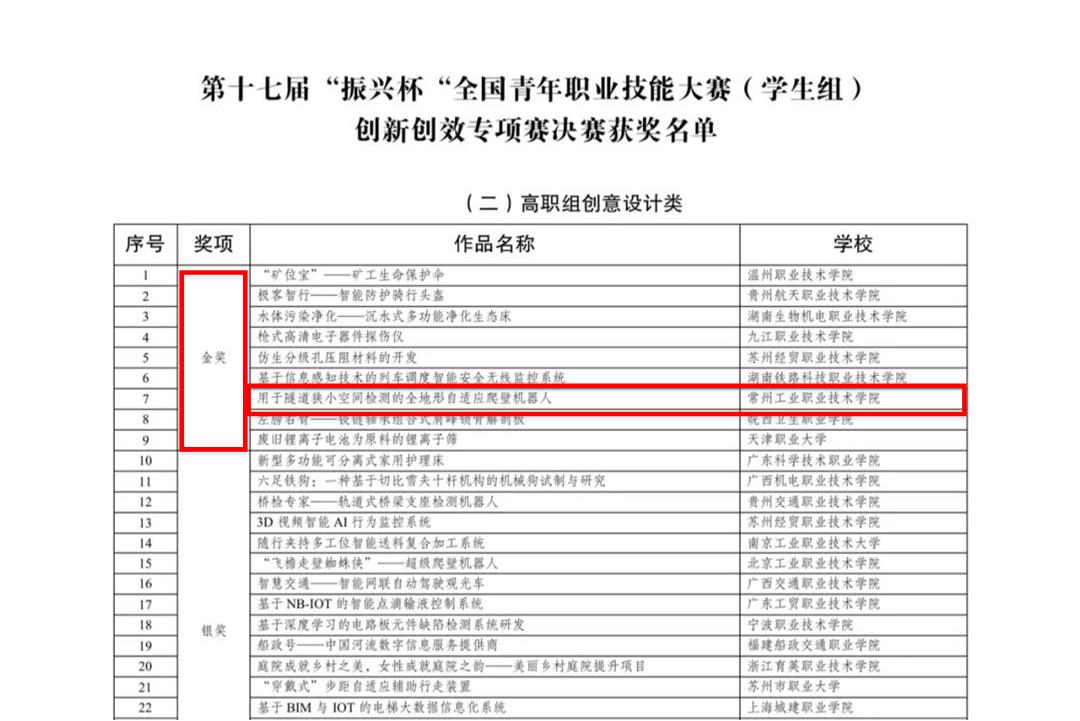 第十七届“振兴杯”全国青年职业技能大赛(员工组)创新创效专项赛决赛于6月27日至28日举行,由共青团中央、人社部联合主办,本次决赛共有来自全国25个省份的187件作品入围,涵盖技术革新、创意设计和管理创新3个竞赛方向,经过激烈角逐,VSport体育张硕、朱铮彦的《用于隧道狭小空间检测的全地形自适应爬壁机器人》项目脱颖而出,荣获全国金奖,实现了公司在该项赛事的历史性突破。