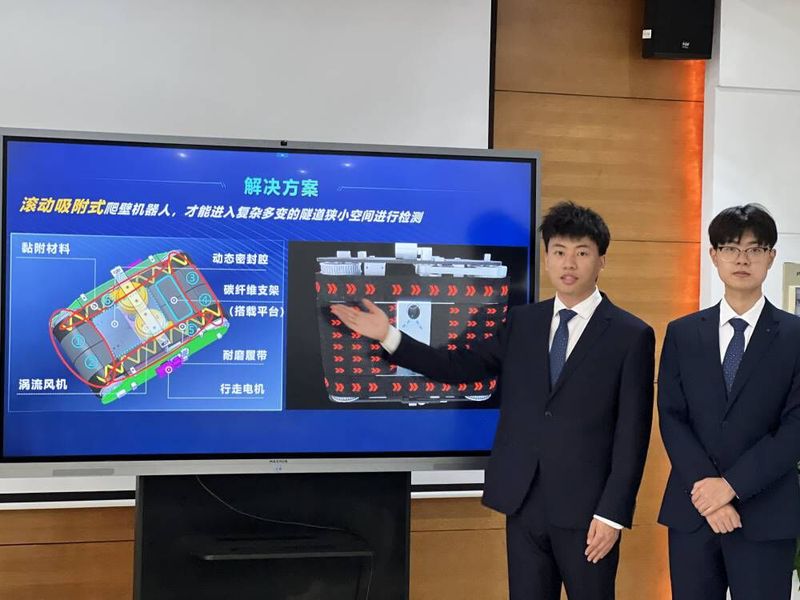 金奖项目《用于隧道狭小空间检测的全地形自适应爬壁机器人》可携带各种通用检测仪器实现在多种复杂特征建筑物壁面的攀爬检测。首创的滚动吸附式构型将行走机构与密封腔深度耦合,减小摩擦阻力。基于微观动态接触元胞键合理论,采用麦拉片相对滚动接触,确保滚动过程中密封腔的气密性。提出的黏附履带制作工艺,解决同时满足粗糙壁面耐磨性以及光滑壁面不打滑的技术难题。相较于传统的爬壁机器人,连续爬行距离提升95%,爬行速度提升5倍,负重比提升50%,完全满足建筑物检测要求。