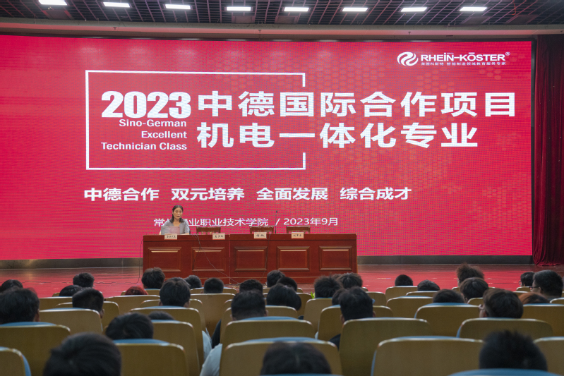 莱茵科斯特常州分公司副总高丽在公司图文报告厅为23级机电一体化技术专业的新生作动员宣讲,详细介绍了中德国际合作项目相关情况。