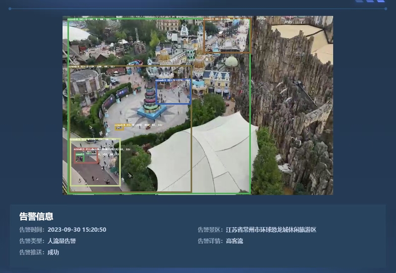 面对国庆假期长,游客量大的特点,无人机应用技术专业的同学充分发挥无人机技术优势,每位同学独立负责一个景区,操控无人机将监测数据上传至5G网联管理运营平台进行实时显示,完成实时超视距远程精准飞行控制与监管,大幅提升了全局态势感知能力,天地协同实现了群众性活动现场巡防全覆盖,圆满完成了八天的监测任务。