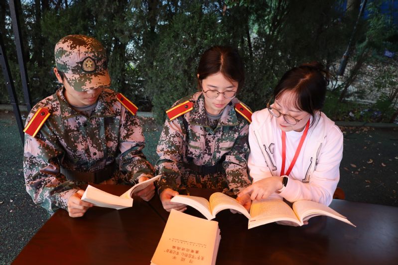 军训现场,23级新生辅导员组织新生在军训休息时间共同诵读、学习《习近平关于“不忘初心、牢记使命”论述摘编》《习近平新时代中国特色社会主义学习纲要》《你好!大学》《匠心花开》等书籍。参与活动的新生们热情高涨,大家选取自己喜爱的读本,并选取其中令人感动感悟较深的片段,进行朗读分享接力。同学们纷纷表示,要进一步树立终身学习的理念,以学习坚定信念、以学习促进发展,不断提升自身综合素能。其中几位员工代表主动分享了他们在阅读中的感想,畅谈学习体会和成长收获。
