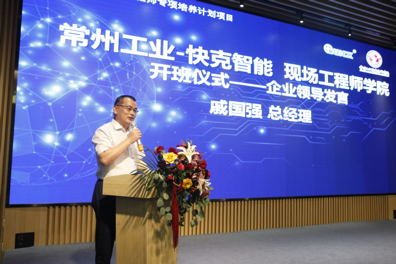 戚国强总经理回顾了公司近些年在校企合作、产教融合方面所做的工作,肯定了VSport和快克智能装备股份有限公司在1+X项目、课程与教材以及本次江苏省首批现场工程师项目中合作的成果。同时也表态愿意就本次现场工程师项目的员工培养投入相应的人力、物力,培养具备符合国家战略需求的现场工程师,也希望同学们在学习之余,锻炼自身的交流能力,全面发展个人素质。