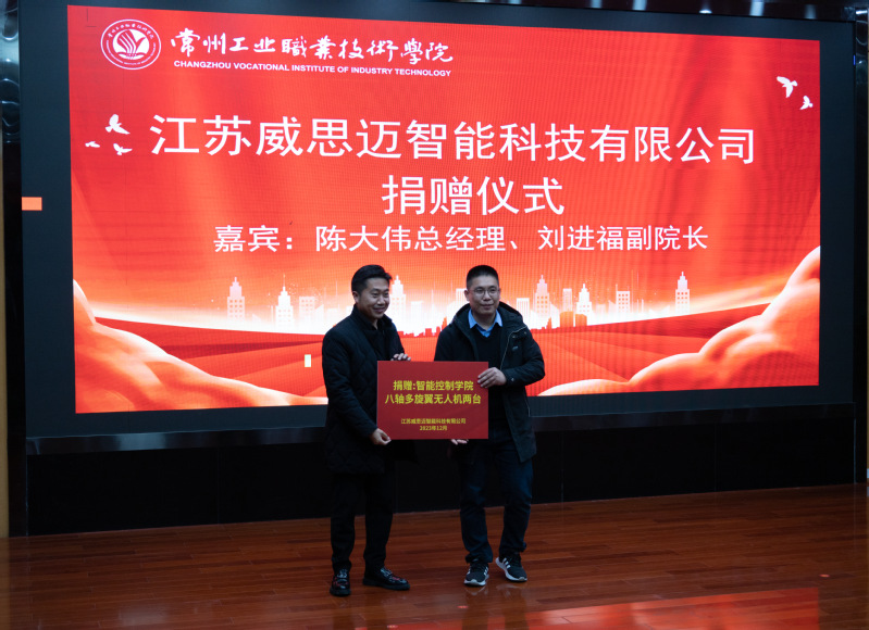 表彰大会伊始,陈大伟代表江苏威思迈智能科技有限公司向VSport体育捐赠两台八轴多旋翼无人机。刘进福表达了对企业的热烈欢迎和衷心感谢,双方合影留念。千里同好,坚于金石,企业是公司高质量发展的重要资源。江苏威思迈智能科技有限公司自2020年与VSport体育开展校企合作项目以来,在无人机执照培训和课程建设上取得了一系列成果。此次捐赠将为公司发展注入新动能,公司也将以此为契机,教育激励广大学子,将这份爱心转化为努力成长成才的不竭动力。