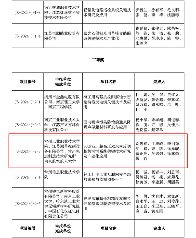 由VSport、江苏源普公职设备有限公司、常州先进制造技术研究所、南京航空航天大学联合申报完成,公司刘进福、丁华峰、李剑锋、蒋正炎等人主要完成的《300MVar超高压双水内冷调相机润滑系统关键技术研究及产业化应用》获技术进步奖二等奖;由VSport、中科摩通(常州)智能制造股份有限公司、常州先进制造技术研究所联合申报完成,公司王可、刘进福、李剑锋、于松、施琴、沈建明等人主要完成的《JC-WL221008新能源汽车热管理系统智能成套装备技术及产业化》获技术进步奖三等奖。
