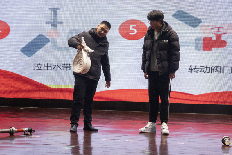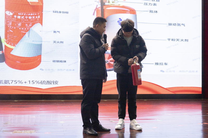 倪鹏向同学们介绍了当前消防安全形势,并结合最近发生的公共场所火灾案例,详细讲解了火灾特点、火灾分类、火灾初期灭火基本方法、常见灭火器材操作使用及适用范围、火灾疏散自救互救方法等内容。培训中,倪鹏邀请同学们上台进行灭火器、消防栓的使用演练,切实提升大家火灾自救和逃生技能。
