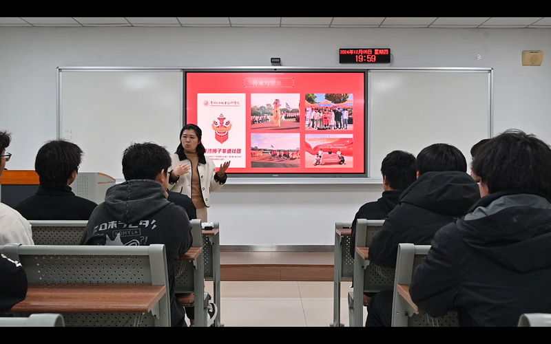 精彩展示,传承人的舞狮表演。黄沙狮子第八代传承人王添宇带来了精彩的舞狮表演,赢得了同学们的热烈掌声。社团成员也向同学们分享了舞狮的基本动作要领及在表演过程中需要注意的安全事项。