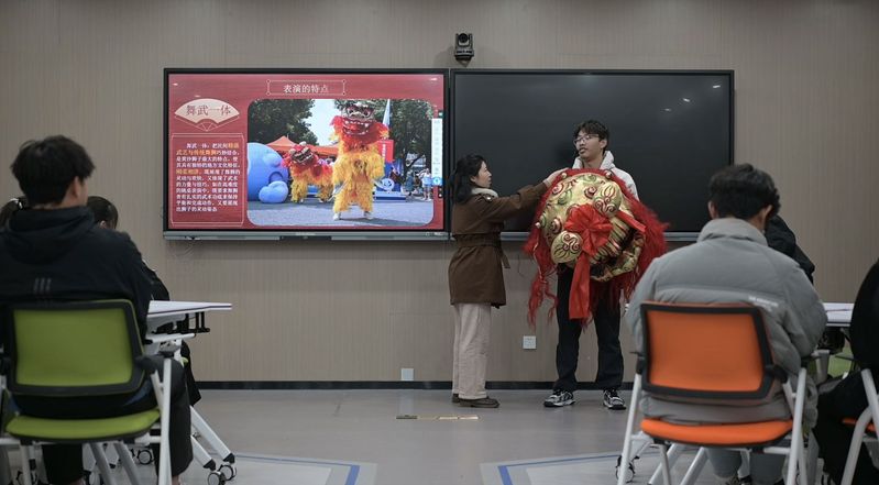 深入学习,了解黄沙狮子的历史。指导老师赵娜娜向同学们详细介绍了黄沙狮子的历史背景、文化内涵、传承现状以及所采取的保护与传承措施。她不仅阐述了舞狮动作的艺术美感,还深入讲解了每个动作背后所蕴含的寓意。