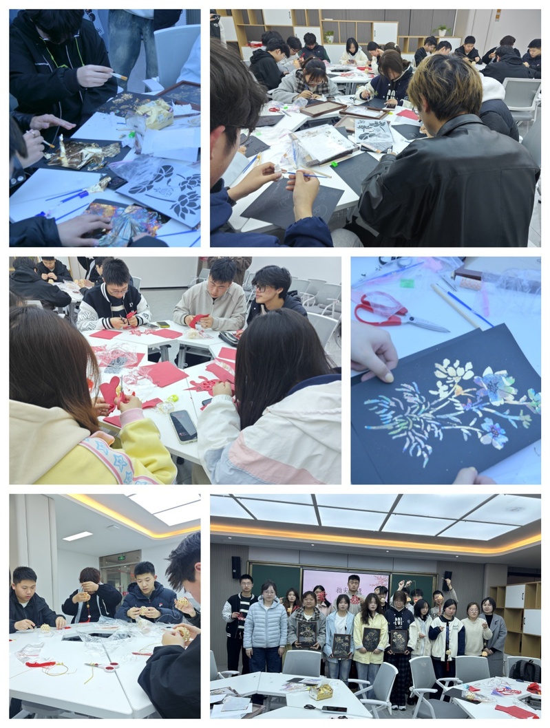 活动现场划分为三个特色体验区。在非遗烧箔画区域,同学们充分发挥创意,将金箔、银箔与天然颜料完美结合。他们运用敲打、拼贴、塑形等一系列精致工序,成功地把金属原本的冷冽质感转化为灵动流动的艺术之美。中国剪纸区则用一抹“中国红”点亮创作热情。员工们跟随老师学习折叠、镂空等技法,将寓意吉祥的纹样化作精美的窗花。员工王卓文手持自己的剪纸成品,脸上洋溢着灿烂的笑容,分享道:“剪纸的时候必须全神贯注,做到‘心静手稳’,一旦剪错一刀就得重新开始。这种高度的专注让我暂时忘却了学业压力。”而在竹编灯笼区,竹篾的清香与经纬交织的韵律相融,员工们在经纬交错的编织中体会“慢工出细活”的匠心理念,一盏盏灯笼渐次成型,暖光映照下更显温馨。