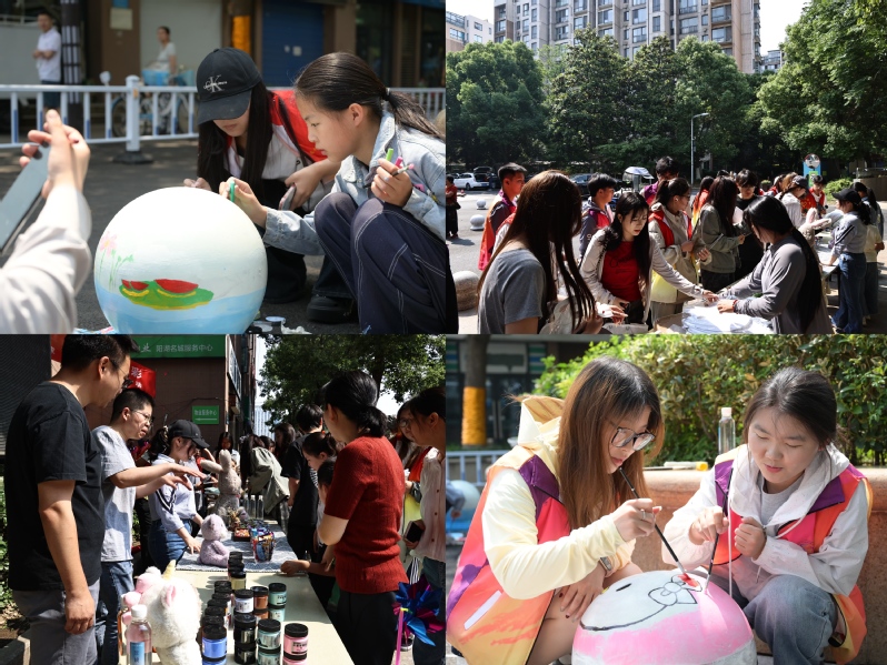在小区主干道的石球旁,艺术创意公司员工手持画笔,以二十四节气、山水花鸟等传统文化元素为灵感,将原本单调的石球绘制成色彩斑斓的艺术品。“这个荷花画得真灵动!”“节气图案还能让孩子学知识呢!”来往居民纷纷驻足称赞。通过艺术创作,支部积极分子不仅美化了社区环境,更以“流动的课堂”形式传播了中华美学精神。